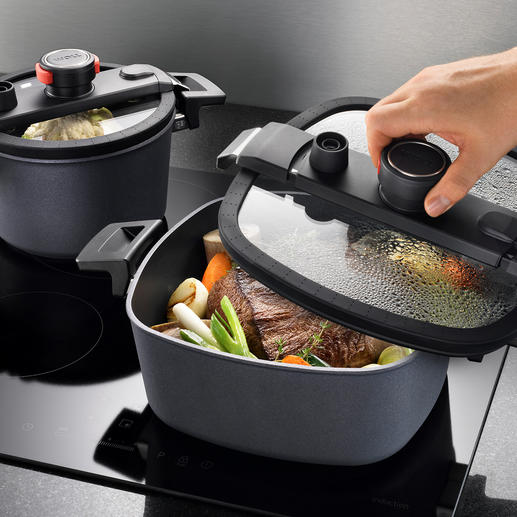 Ces superbes casseroles sont équipées d’un joint en silicone spécialement développé qui ferme hermétiquement l’espace de cuisson. Résultat : la perdition de vapeur est réduite à son minimum. Une légère surpression se forme dans la casserole et la température monte à près de 100 °C. Ainsi, vos plats cuisent jusqu’à 50 % plus rapidement. Les vitamines et les nutriments sont préservés. Les légumes, la viande, le poisson conservent leur goût, leur couleur et leur texture.
