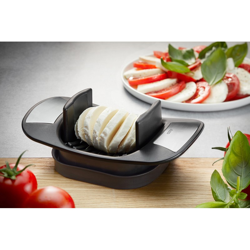 Le moyen le plus rapide pour préparer une salade caprese aromatique : des lames spéciales judicieusement disposées qui plongent les unes après les autres dans le légume ou le fromage et le coupent facilement en tranches régulières. Le compagnon idéal pour les salades italiennes fraîches.