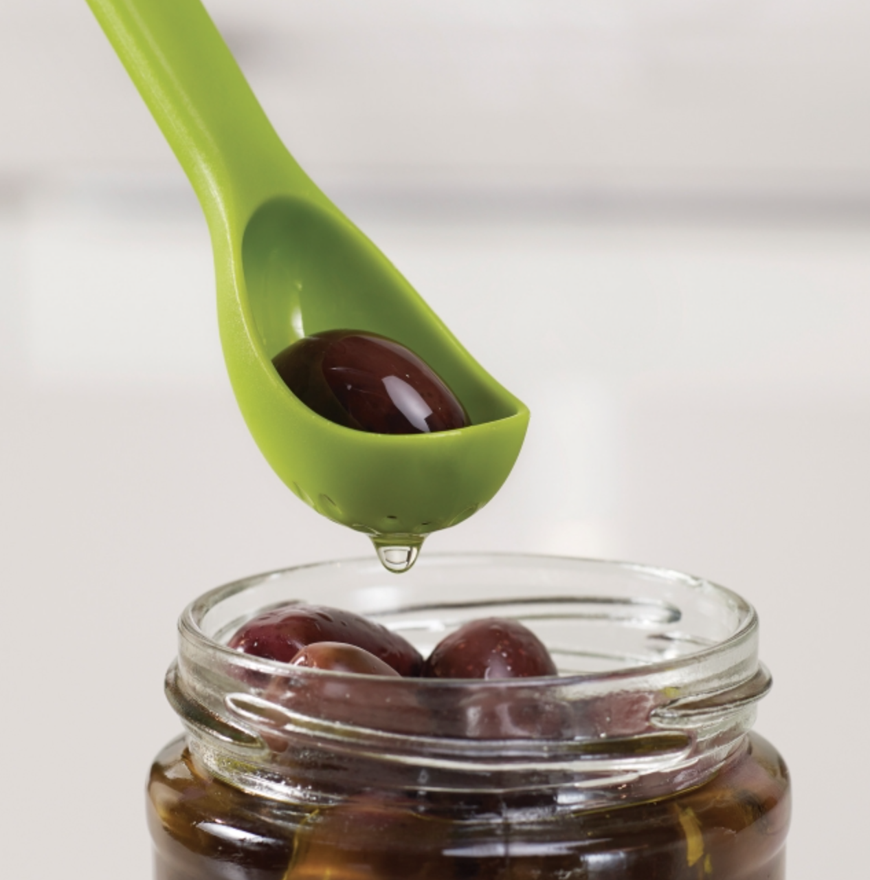 Cet ustensile 2 en 1 vous permet de servir des antipasti et des olives sans bavures.