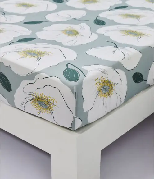 Sur ce drap housse, des fleurs généreuses et étonnantes déploient avec douceur leurs pétales délicats et vaporeuses.
