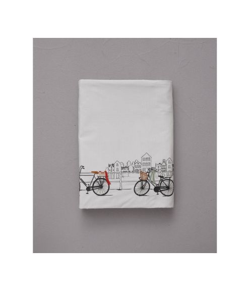 Une petite balade en vélo? Nous vous proposons une escapade urbaine et bucolique dans la capitale néérlandaise. Brodé avec un fil bleu marine sur un fond mascarpone, le paysage est rythmé de quelques touches de couleurs qui apportent une note de bonne humeur et qui permet une association facile avec nos unis. Linge de lit brodé création exclusive Sylvie Thiriez. Coloris mascarpone, dos imprimé rayure mascarpone et bleu marine. Broderie bleu marine touche de rose, rouge, caramel et vert sauge. CERTIFICAT OEKO-TEX® CQ 1021/1 IFTH LYON