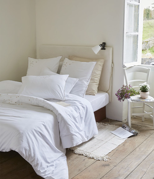 Cette housse de couette en percale de coton brodée sur fond blanc, glissera dans votre chambre, une discrète touche de romantisme dans un style espiègle et raffiné.