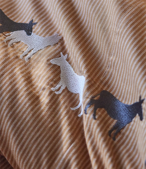 Les ânes noirs et beiges sont brodés sur une jolie rayure caramel à l’aspect texturé. Le passepoil noir autour des taies apporte une touche de modernité. Cette housse de couette donnera à votre chambre une ambiance chaleureuse et conviviale.