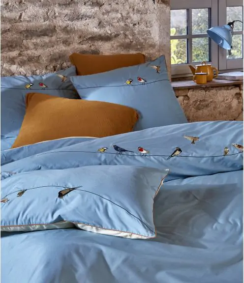 Housse de couette brodée d’oiseaux.