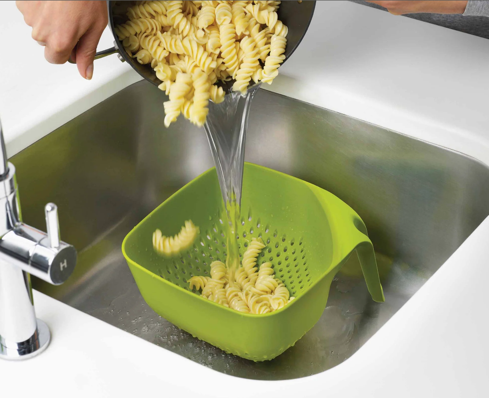 Grâce à son astucieuse poignée, la passoire se maintient droite et stable d’une main lorsque vous rincez ou égouttez vos aliments.