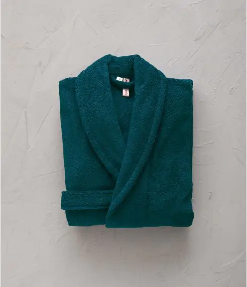 Peignoir éponge finition col châle, pur coton peigné, 450g/m². Poches plaquées sur le devant, ceinture avec passants.