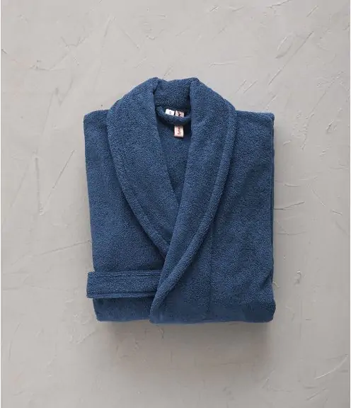 Peignoir éponge finition col châle, pur coton peigné, 450g/m². Poches plaquées sur le devant, ceinture avec passants.