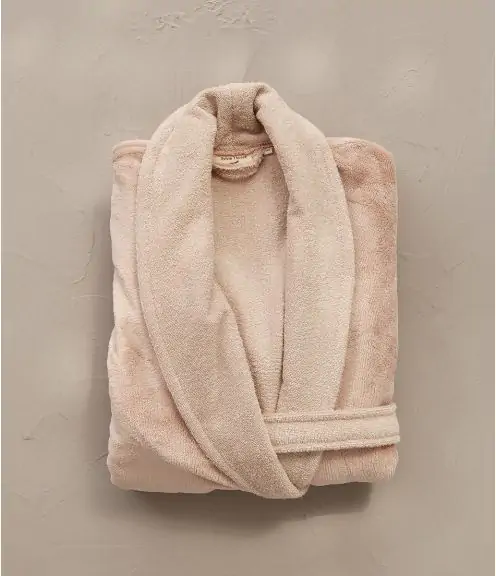 Robe de chambre bi-matière 57 % polyester, 43 % coton, extérieur polaire et intérieur éponge. 270g/m3. Existe dans les tailles S, M, L et XL