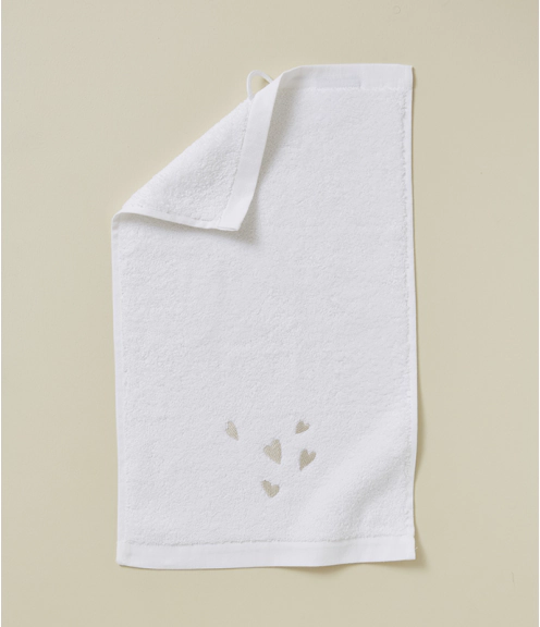 Des dizaines de cœurs inondent ce linge de bain de tendresse. Ils sont brodés avec simplicité dans un joli coloris beige.