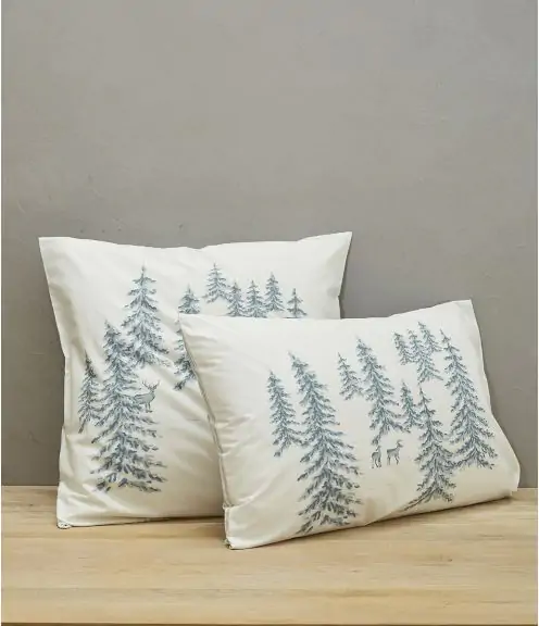 Taie d’oreiller sac en percale de coton « mascarpone » imprimée d’un paysage nordique avec sapins, cerfs et biches. Revers imprimé d’une rayure légère.