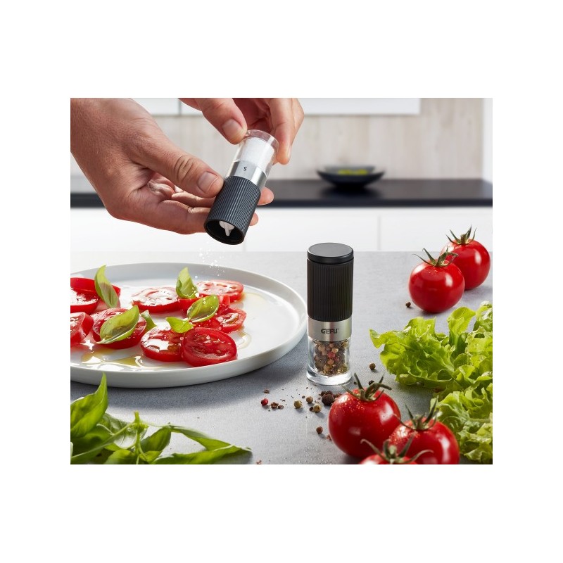 Petit, robuste et idéal pour rectifier l’assaisonnement ! Que ce soit à la table de la salle à manger, au camping ou sur la couverture de pique-nique, les deux mini moulins avec couvercle spécial arôme sur leur socle de forme épurée fournissent la saveur en tenue élégante. Ils sont équipés d’un broyeur céramique réglable en continu, de grossier à fin.